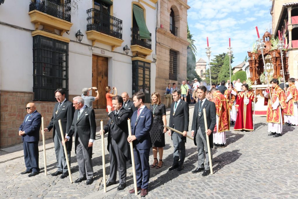 La alcaldesa de Ronda, Mª Paz Fernández, ha acompañado hoy a la Agrupación de Hermandades y Cofradías en los actos con motivo de la celebración del Corpus Christi y que han comenzado con una multitudinaria Eucaristía celebrada en la Iglesia de Santa María la Mayor.  Posteriormente se ha iniciado la procesión en la que han participado representantes de todas las hermandades de Pasión y Gloria de la ciudad. Además del Santísimo, se han procesionado a las imágenes de la Reina de la Familia y del Niño de Praga, recorriendo un itinerario donde han estado también presentes los tradicionales altares que han montado algunas de las hermandades rondeñas en varios puntos. La música ha corrido a cargo de las dos bandas de música de la ciudad, ‘Arunda’ y ‘Aureliano del Real’.