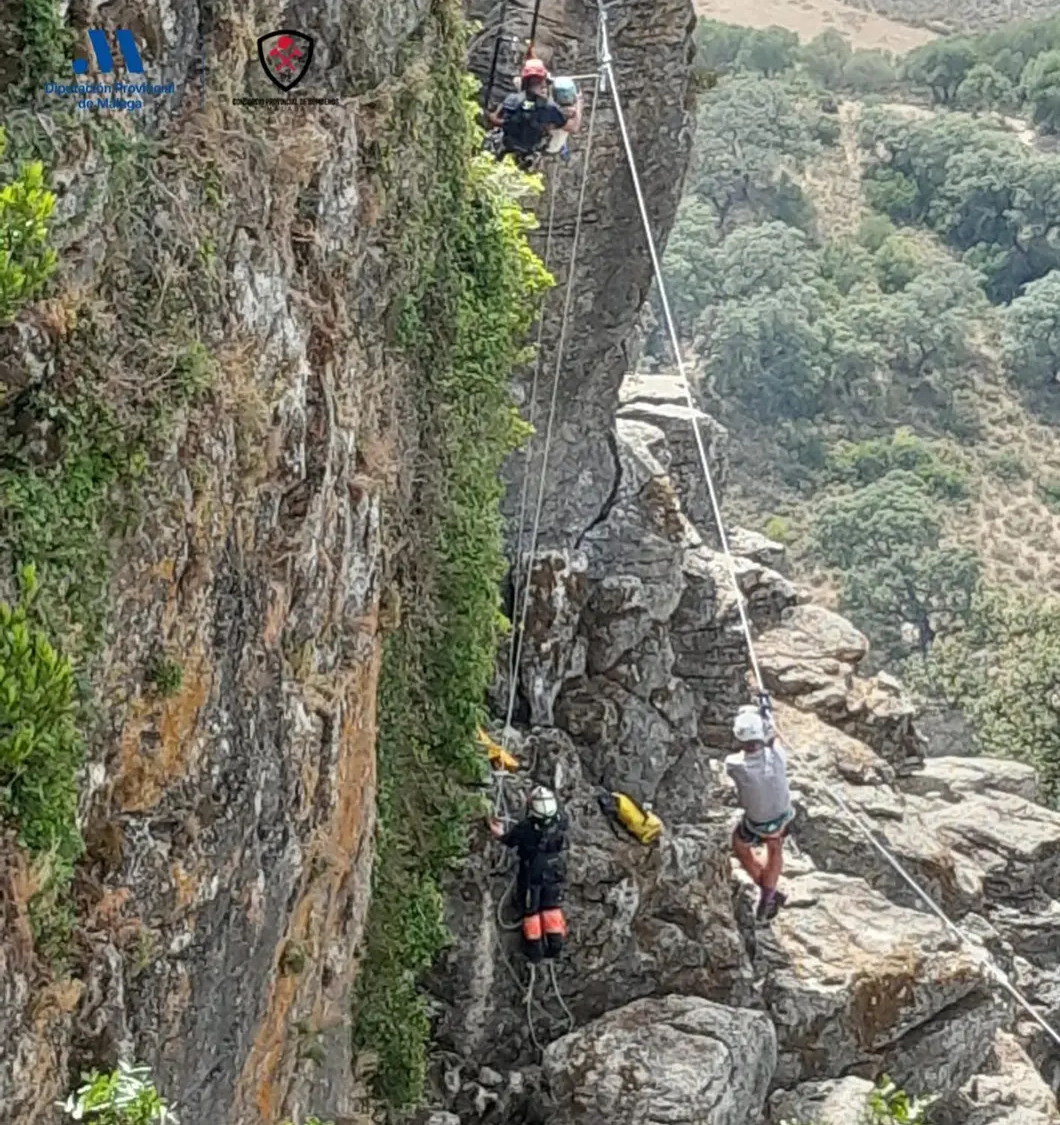 Efectivos del Consorcio Provincial de Bomberos de Málaga rescataton este martes a dos personas en el municipio de Gaucín que habían quedado atrapadas en la tirolina en la que se encontraban en un paraje natural.Tras recibir el aviso de la emergencia, bomberos de las dotaciones de los municipios de Algatocín y de Ronda se desplazaron hasta la tirolina de la vía ferrata de El Hacho, donde se encontraban estas personas.