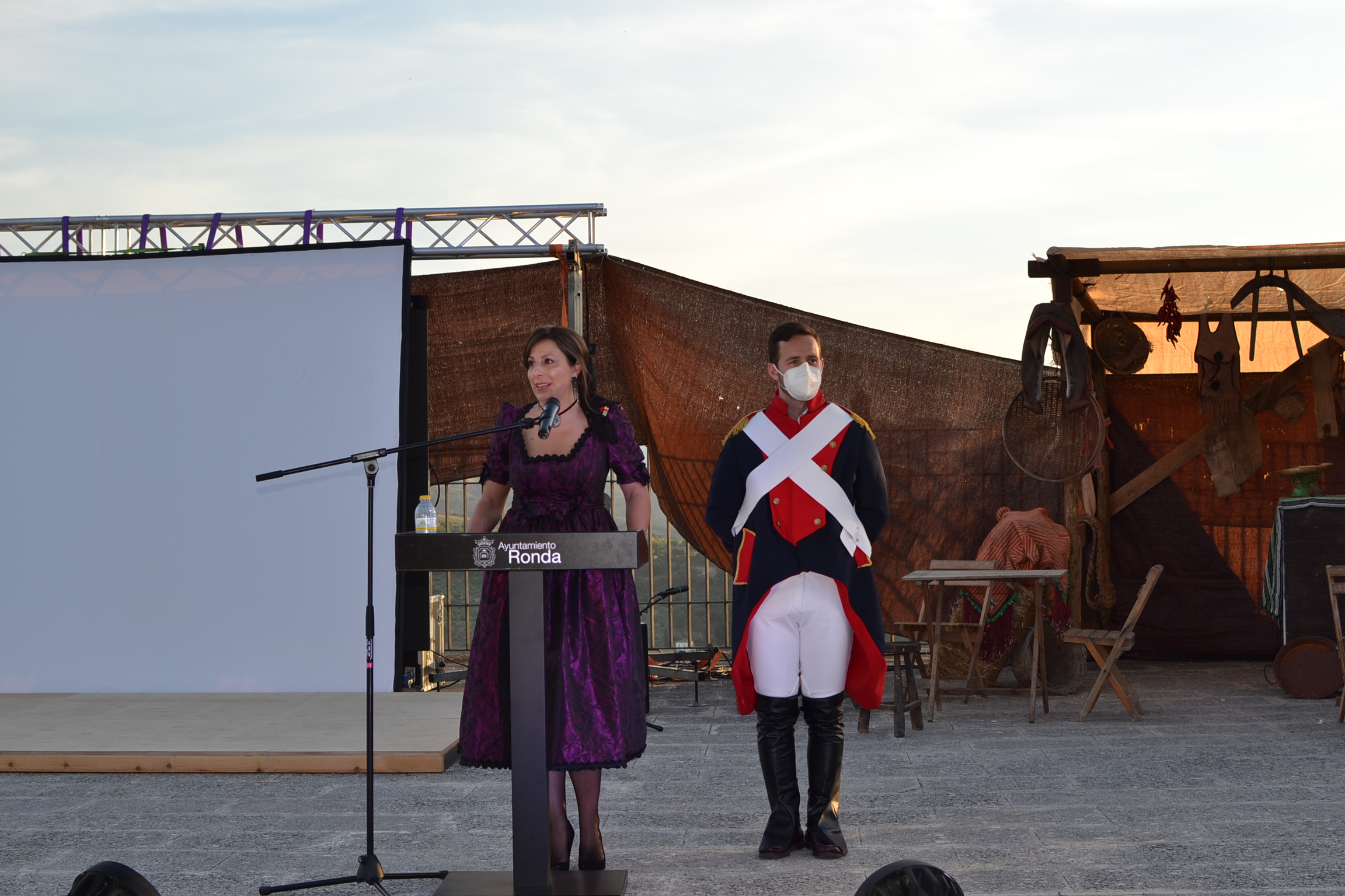 En su intervención manifiesta la alegría tras el duro año vivido por las circunstancias de la pandemia y agradece a todos su presencia y muestra la satisfacción de poder llevar a cabo el evento que pretende recuperar la esencia de Ronda Romántica, tras dos años de suspensión. También reconocimiento a todos los que han hecho posible el espectáculo; al delegado de Participación Ciudadana Ignacio Alonso a Faustino Peralta Cronista Oficial de Ronda y responsable del guion y la dirección narrativa y a Marcos Marcell por la realización y dirección escénica así como alrededor de los 50 participantes que han conseguido recuperar la esencia de nuestra fiesta y recordar su celebración, con ésta representación escénica de nuestra identidad cultural. Recuerda que hubiese sido el día y momento donde se estaría celebrando el pasacalles desde el barrio de San Francisco y desea que sea una realidad , junto al resto de celebraciones de Ronda Romántica para el próximo año 2022.