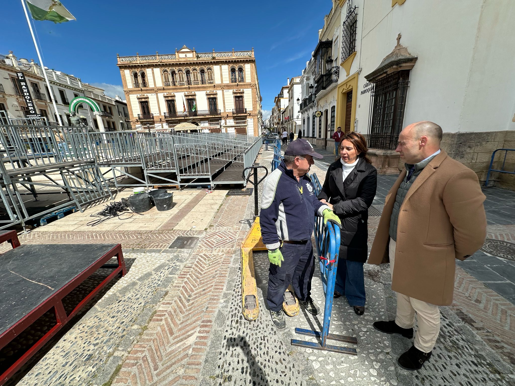 La concejal ha señalado que se trata de unas labores que realizan los operarios municipales y que, en esta ocasión, tendrá novedades que se podrán ver, especialmente, en la presidencia de la tribuna, afirmando que este lugar es un lugar de paso de miles de personas donde se viven momentos muy especiales con las hermandades rondeñas. Una decena de trabajadores de la delegación de Obras están trabajando en este montaje donde se ampliará la tribuna con varios elementos nuevos con una inversión de 8.000 euros, permitiendo una nueva imagen para la Carrera Oficial de Ronda.