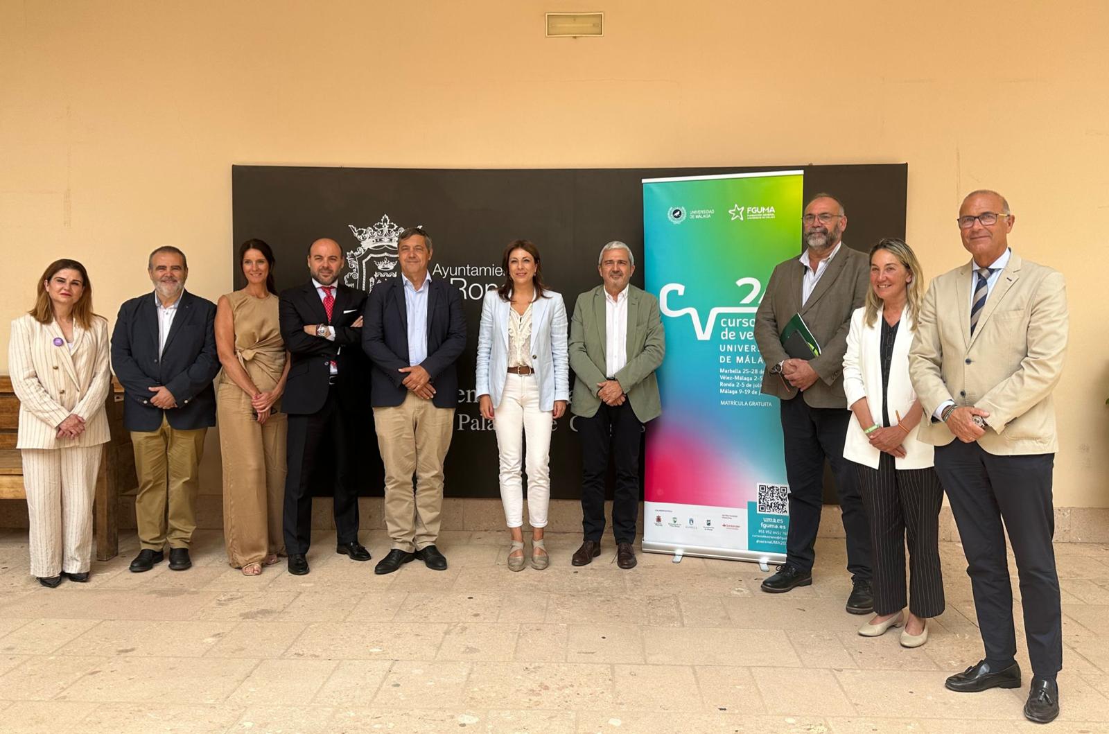 En la presentación, celebrada esta mañana, han participado Juan Teodomiro, rector de la UMA; Diego Vera, director de la FGUMA; María de la Paz Fernández, alcaldesa de Ronda; Joaquín Osuna, director de División de Medios y Recursos de la Fundación Unicaja, Pablo Lara Muñoz, director de la Cátedra ASISA de Salud Cerebral y Cognitiva para su desarrollo (UMA) y director de uno de los cursos, y Juan Manuel Ballesteros Bustos, representante del Banco Santander.