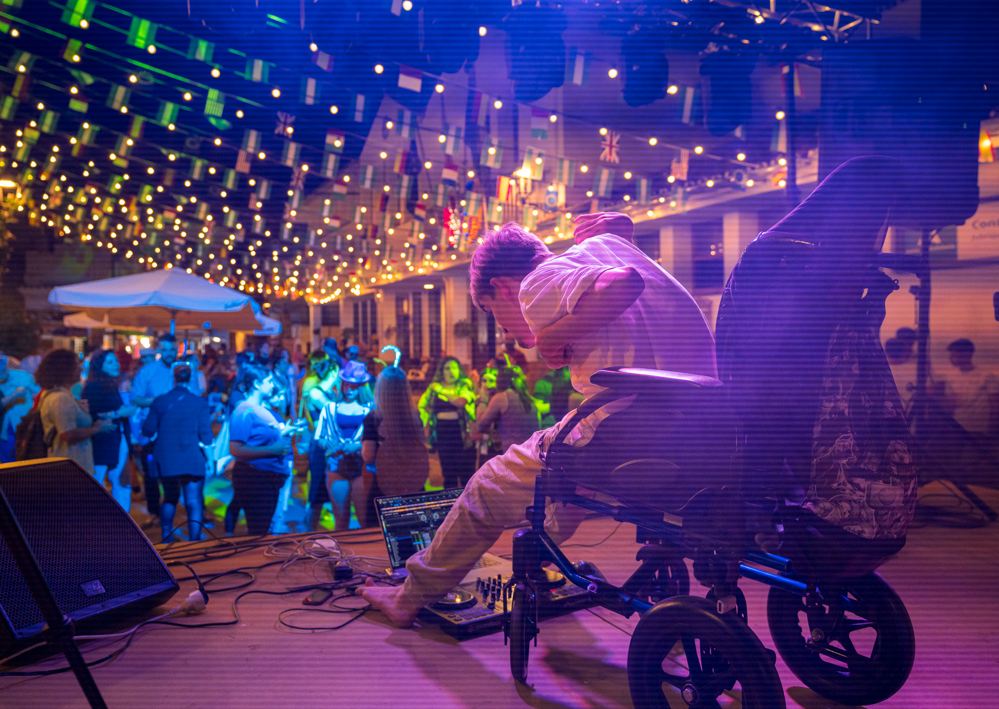 “Mis padres fueron muy claros conmigo, ellos no veían mi carrera como artista debido a mi dificultad motora. Les costaba entender cómo iba a manejar una mesa de mezclas y yo les respondí que podía hacerlo ya que jugaba a la Play con un mando normal, que solamente necesitaba tiempo y ensayo. Mis padres en un inicio no estaban muy seguros pero finalmente confiaron en mí y, ahora, pasados los años, han visto que estoy consiguiendo mi sueño y que puedo crear música y pinchar con mis pies.”