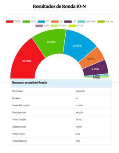 Otro dato que no debemos dejar de lado es la participación que baja casi 6 puntos pasando del 72.19% en abril al 66.55% de ayer donde votamos 18.102 rondeños y no acudieron a las urnas 9.098 personas. Se registraron 304 votos nulos, también más que en las anteriores generales y 268 votos en blanco, casi el doble que en abril.