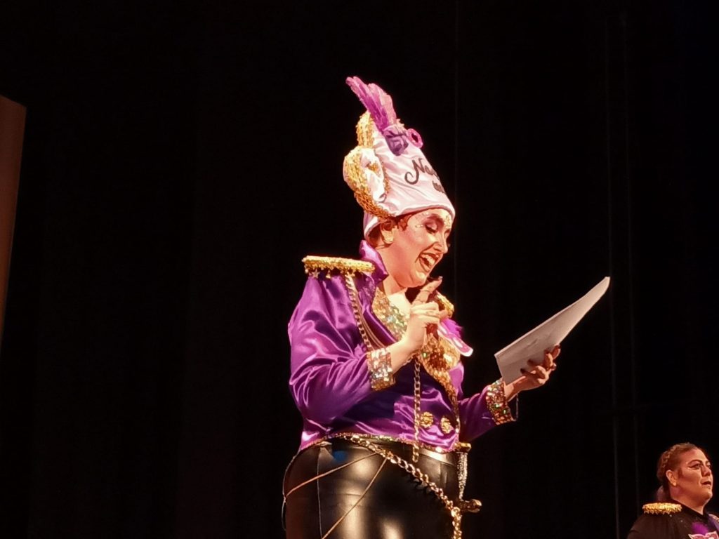 El Teatro Vicente Espinel volvió a sonar este viernes a Carnaval con Marta Pérez y un pregón cargado de elegancia, talento, mucha sororidad y reconocimiento a las mujeres en esta fiesta, tanto en el pasado como en el presente y el futuro. Introducida por el maestro José María Tornay, acompañada al piano por Curro Bautista y arropada por sus “hermanas carnavaleras”, la pregonera hiló un relato con sus vivencias más personales, su participación en distintas agrupaciones carnavalescas, guiños al Carnaval de Cádiz y un sentido homenaje al desaparecido Juan Carlos Aragón que puso el patio de butacas en pie. “Esa fábula de la igualdad, donde en aras de la Libertad las guerreras se sublevan al dragón con la vida toda por conquistar”, cantó Marta a las carnavaleras más pequeñas que se sentaban en ese momento al borde del escenario.