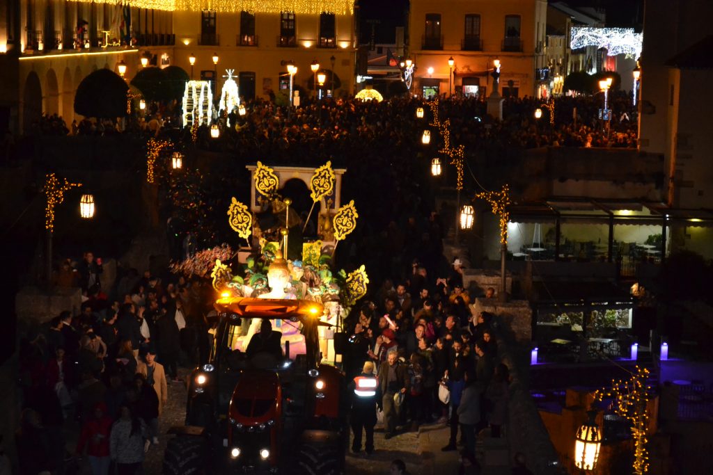 Miles de ciudadanos se han echado a la calle para disfrutar de la Cabalgata de los Reyes Magos con la que finalizan las celebraciones navideñas. Conformada por doce carrozas, animaciones y acompañamiento musical, el cortejo ha recorrido Carrera Espinel, Virgen de la Paz y por primera vez, ha atravesado el Puente Nuevo finalizando en Ruedo Alameda. Allí se ha llevado a cabo la tradicional Adoración en un portal viviente organizado por la Asociación de Vecinos del Barrio de San Francisco y la Hermandad del Santo Entierro. También los más pequeños han tenido la oportunidad de mantener un último encuentro con Sus Majestades de Oriente antes de que comiencen su periplo por los hogares dejando juguetes y regalos. La alcaldesa Mari Paz Fernández junto a los concejales Jesús Vázquez, María del Carmen Martínez, Concha Muñoz, Alicia López, Cristina Durán y Ángel Martínez, han disfrutado del paso de la cabalgata a pie de calle y posteriormente han compartido un rato de convivencia con los vecinos del Barrio de San Francisco.