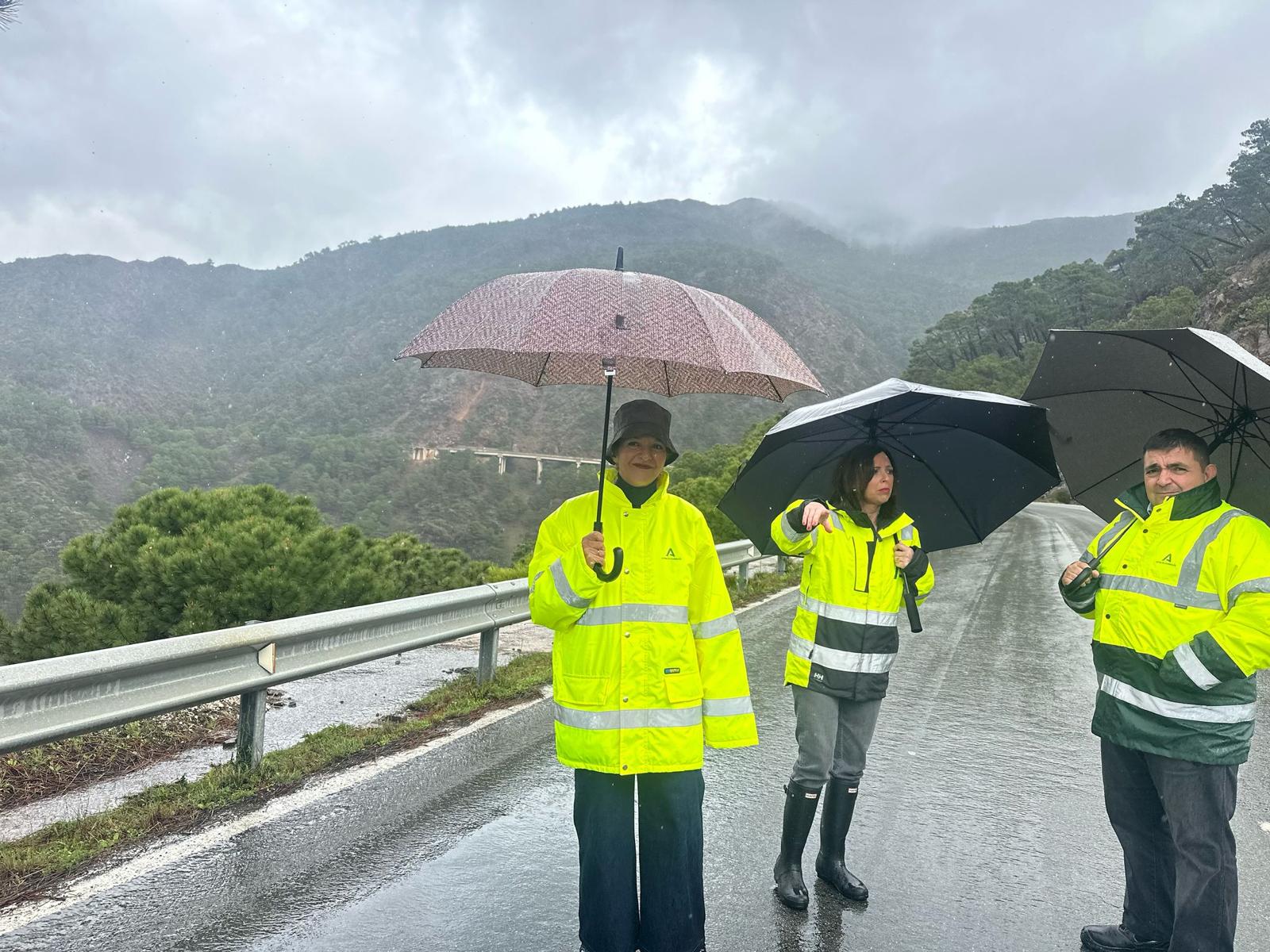 La consejera de Fomento, Articulación del Territorio y Vivienda, Rocío Díaz, ha visitado la carretera de Ronda a San Pedro de Alcántara (A-397) para comprobar los daños que ha ocasionado la borrasca Jana y que obligaron el pasado sábado al corte total de la vía entre los kilómetros 11 y 37. Rocío Díaz ha trasladado que desde el primer momento se han empleado todos los medios para actuar en una carretera que ha sufridos graves desperfectos por la caída de rocas sobre la calzada. “No se ha parado ni un momento, ya que el domingo firmamos la emergencia y empezamos a trabajar con todos los equipos, desplegamos sobre el terreno drones y un equipo vertical especializado en taludes”, ha remarcado la titular de Fomento.
