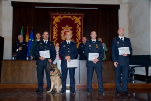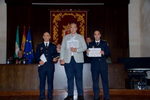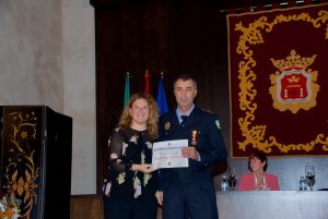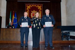 CRUZ AL MÉRITO POLICIAL CON DISTINTIVO ROJO, a los miembros de la Policía Local, Miguel Valle y Francisco javier Santos-Menis, condecorados por la Consejería de Justicia e Interior de la Junta de Andalucía por la actuación realizada en la entrada a una vivienda donde se había originado un incendio y rescate de una persona inconsciente por la inhalación de gases tóxicos.