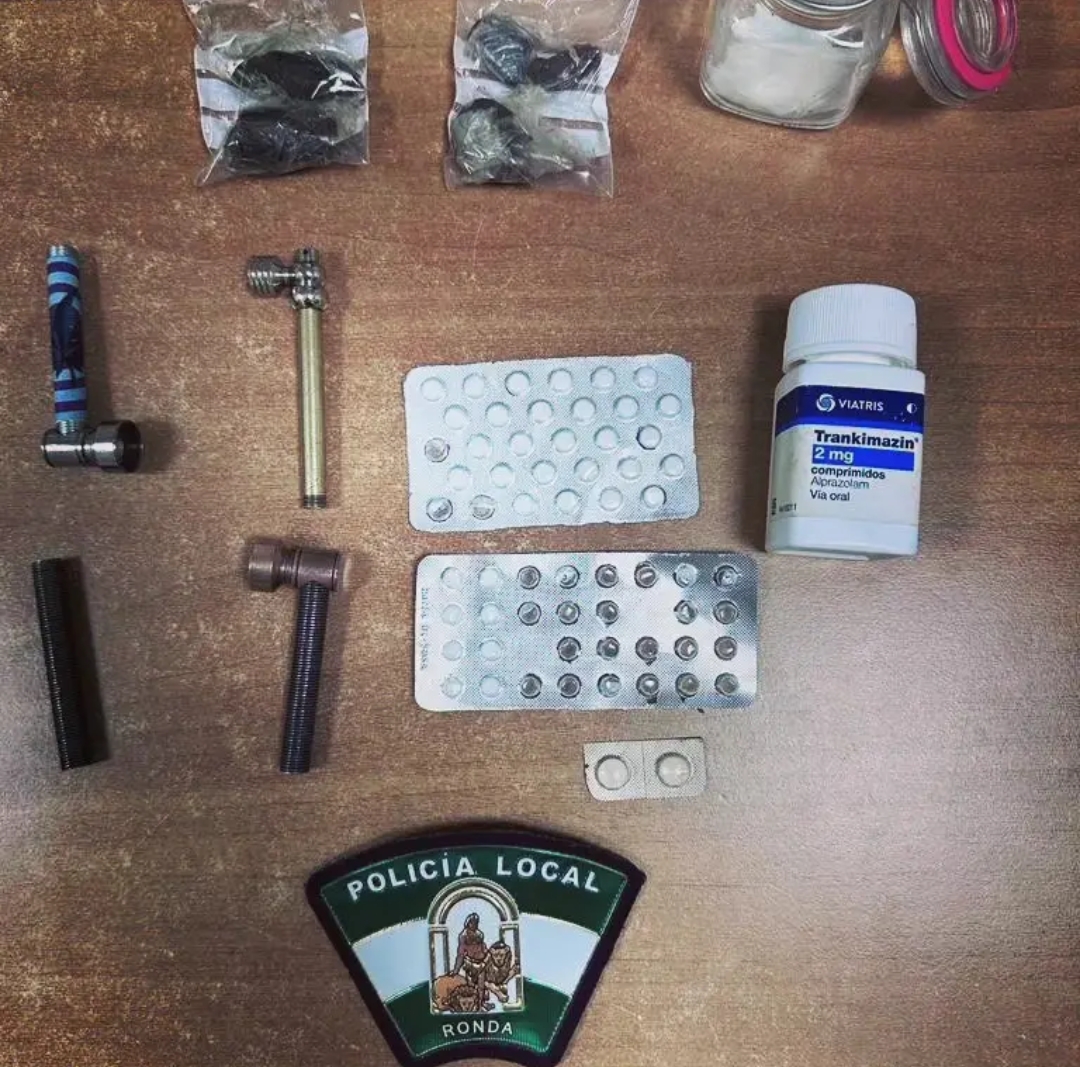 Hasta el lugar se desplazaron varias dotaciones donde una persona les requirió dado que, al parecer, un individuo había entrado a robar en su casa. En ese momento se observa a una persona saltando un muro de la mencionada vivienda. Los agentes le interceptaron e identificaron y se procedió a su detención al manifestar el dueño de la vivienda que se trataba del presunto ladrón, quedando posteriormente a disposición judicial. Al ser cacheado este individuo, se le aprehenden varios trozos de sustancias estupefacientes (hachís), unas tabletas de Diazepam y Tranquimazin, medicamentos que no se pueden obtener sin receta, según recuerda la Policía Local.