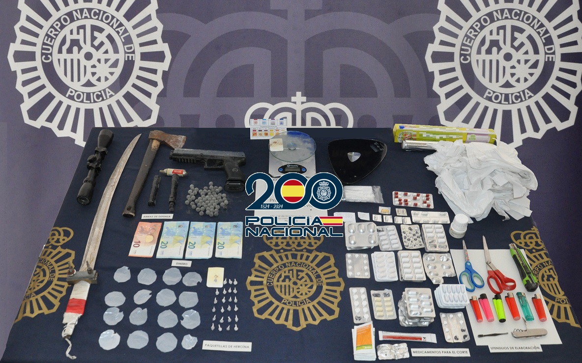 Durante el registro domiciliario, los agentes intervinieron más de una veintena de papelinas -mezcla de heroína y cocaína-, varias cajas de medicamentos, una balanza de precisión, un arma simulada y dinero en efectivo
