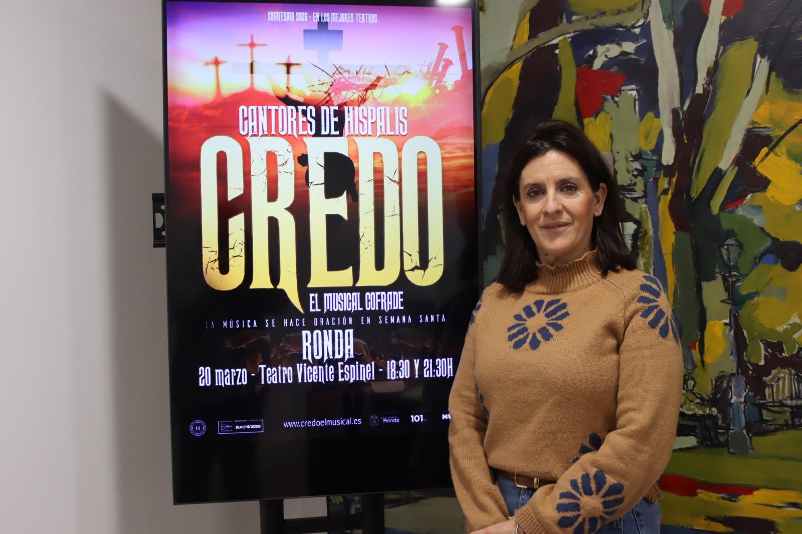 La concejala ha explicado que es un musical inspirado en la Semana Santa que se podrá ver a las 18.30 y a las 21.30 horas y las entradas están ya a la venta en www.surentradas.com. ‘Credo’ se define como una declaración de fe escénica que reivindica nuestras tradiciones y tiene como objetivo conmover con una experiencia artística y musical. El proyecto fusiona música y emoción en un espectáculo de gran impacto visual con Cantores de Híspalis y más de 25 artistas sobre el escenario con la dirección de José Enrique de la Vega. Además, destaca la participación de Enrique Casella, pregonero de la Semana Santa de Sevilla o del Coro de la Caleta dirigido por Julio Pardo, además de las cornetas de la banda de las Tres Caídas y la voz lírica de Natalia Carceleiro