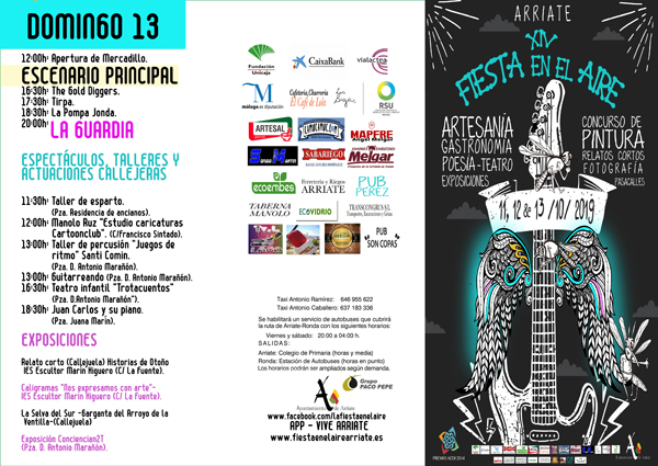 Del 11 al 13 de octubre, el municipio de Arriate espera recibir a más de 25.000 visitantes durante la celebración de su XIV Fiesta en el Aire, una festividad declarada de Singularidad Turística Provincial por la Diputación de Málaga. La programación del evento, centr ada en la música en directo, se completa con concursos, talleres, exposiciones y espectáculos de teatro y magia.