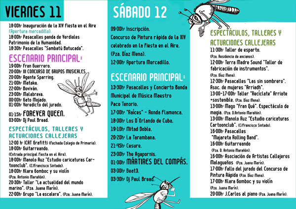 El sábado 12, la actividad en el escenario principal comenzará a las 17.00 horas con el espectáculo Raíces – Ronda Flamenca, al que seguirán los conciertos de Los D’Orlando de Cuba, Mitad Doble, La Tarambana, Cesure, The Agapornis y, encabezando el cartel, Mártires del Compás, que subirán al escenario a la 1.00. A las 3.00 actuará el grupo tributo a The Beatles Beat3.