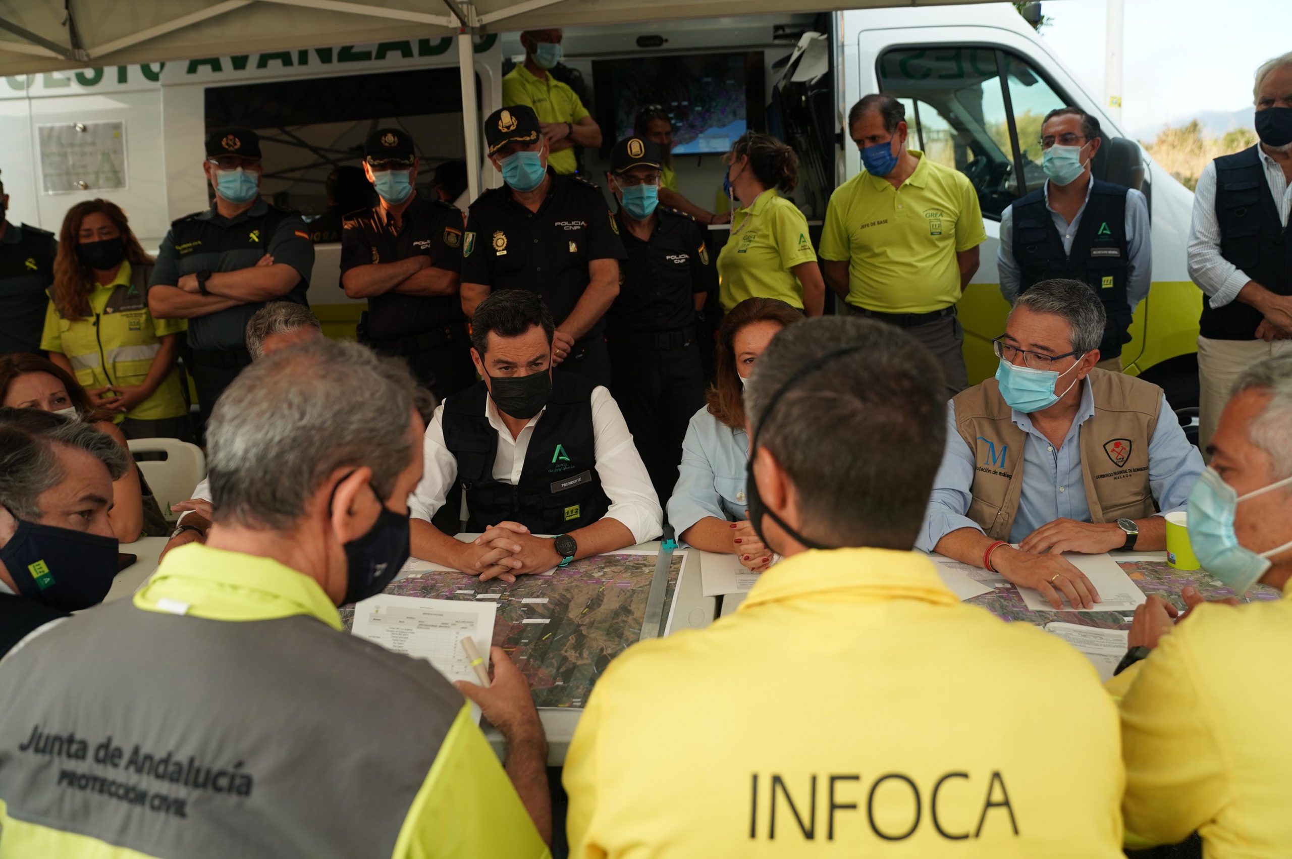 El presidente de la Junta analiza la situación junto a miembros del Infoca en el Puesto de Mando Avanzado.
