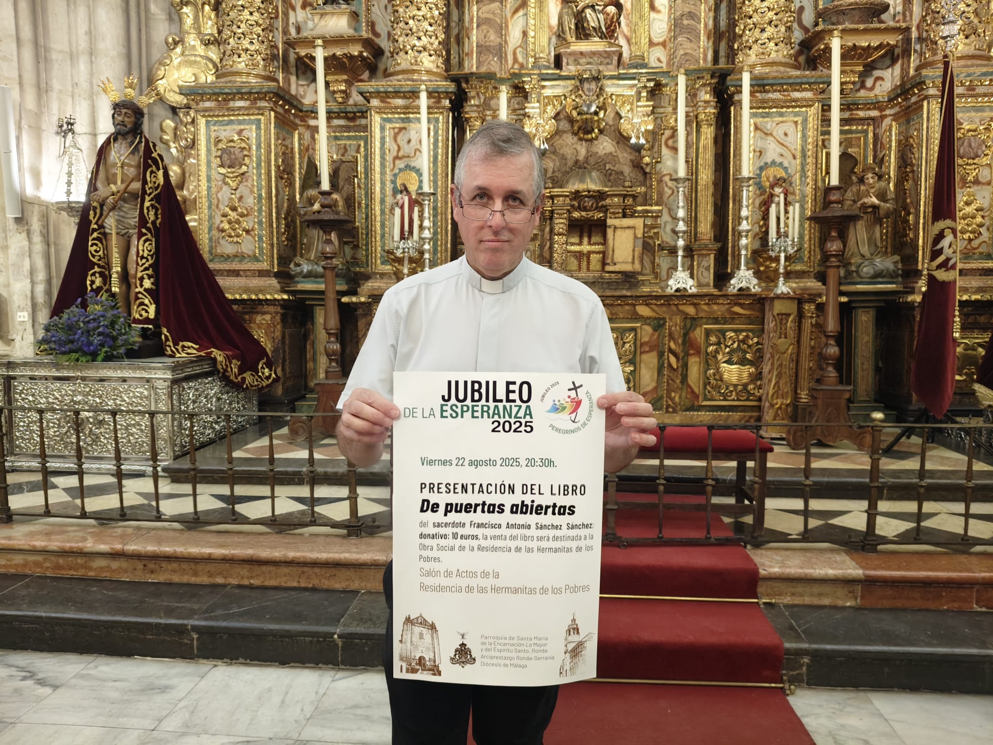 El sacerdote Paco Sánchez presenta este viernes su nuevo libro. Tiene por título “Puertas Abiertas” y en él el religioso ha recogido sus reflexiones personales escritas entre 2018 y 2020. Se trata también de una iniciativa incluida en el Jubileo de la Esperanza que tiene un carácter totalmente solidario ya que lo que se recaude con su venta se destinará íntegramente a la labor social de las Hermanitas de los Pobres. Precisamente, dicha presentación tendrá lugar el viernes 22 de agosto a las 20.30 horas en el salón de actos de la residencia de las Hermanitas de los Pobres en un acto que estará amenizado por el coro procedente de Vélez-Málaga.