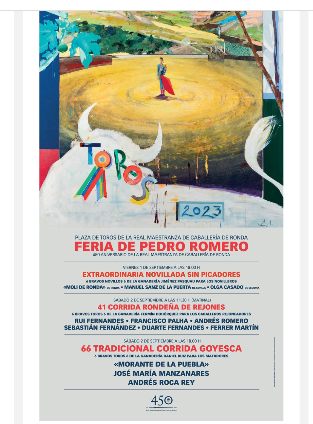 La Feria de Pedro Romero de Ronda 2023 ya es oficial y consta este año de la tradicional corrida Goyesca, una corrida de rejones y una novillada sin caballos que se celebrarán los días 1 y 2 de septiembre, con doblete el sábado 2 ya que ese día se celebrará la corrida de rejones en horario matinal y la Goyesca por la tarde, tal y como sucediera en las dos últimas ediciones.