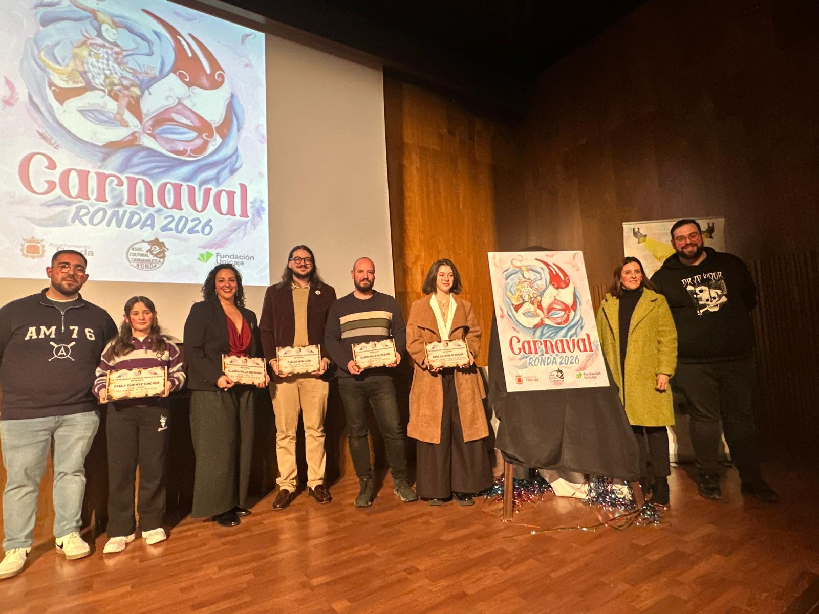 Ronda ya tiene cartel anunciador de su carnaval 2026 y se conocen los nombres de los principales protagonistas de esta celebración. La Asociación Cultural Carnavalesca y la delegación de Fiestas organizaron el pasado viernes en acto de presentación de las reinas, Dios Momo, pregonero y la obra que dará a conocer el carnaval rondeño que estará marcado por la nueva junta directiva de la asociación y el impulso que se quiere dar a estos festejos en este año.