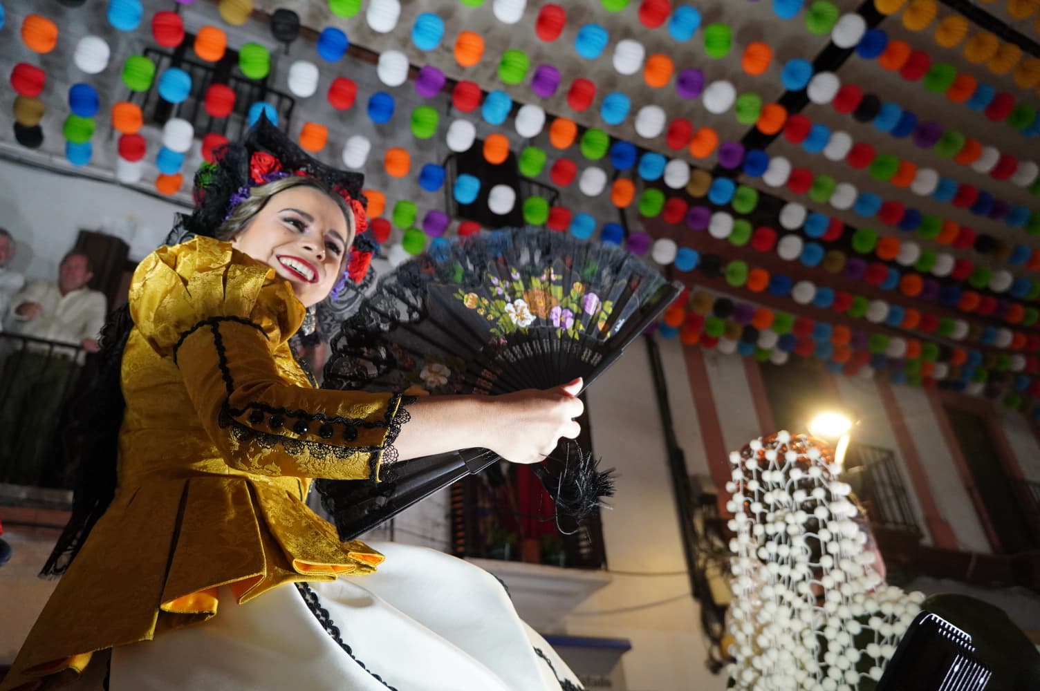 Ya en el recinto ferial Ángel Harillo se llevó a cabo el espectáculo de fuegos artificiales y la alcaldesa, Mari Paz Fernández, acompañada por las Damas Goyescas y la Presidenta y el presidente de la Asociación de Peñas de Ronda, Juan Diego Rodríguez, procedió al encendido del alumbrado, viviéndose uno de los momentos más esperados.